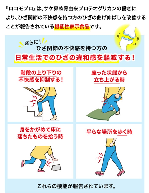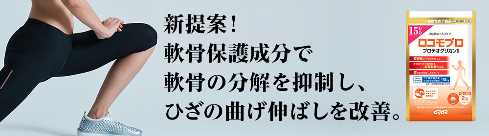 「ひざ関節」に関して、あなたのお悩みを教えてください。 ひざがズキズキする 階段の上り下りがツラい 趣味が楽しめない 家族に迷惑をかけてしまいそうで不安 ひざの違和感の原因は「軟骨成分の分解」によるものだと知っていましたか? はい いいえ ダイドードリンコ『ロコモプロ』の特長で、魅力的なものはどれですか? 「軟骨成分の分解」を抑制するプロテオグリカン配合※ 消費者庁に届け出済の機能性表示食品 3か月でひざの曲げ伸ばしの改善が報告されている※ ※サケ鼻軟骨由来プロテオグリカンの働きによりひざ関節の不快感を持つ方の軟骨成分の分解を抑え関節軟骨の保護に役立つことが報告されています。 ご協力いただきありがとうございました。