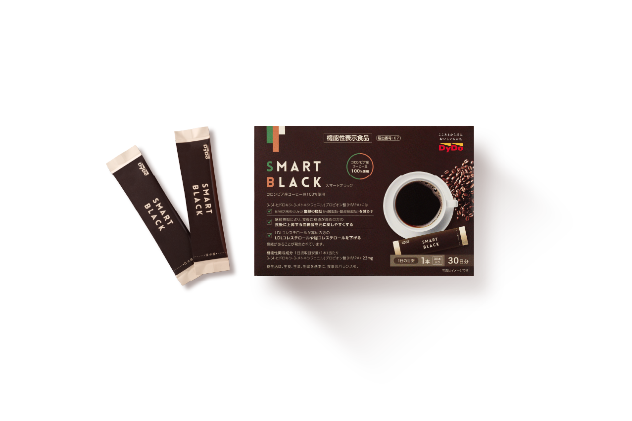 『スマートブラック』とはどのような商品ですか?本品は、米ぬかを発酵して得られる、3-(4-ヒドロキシ-3-メトキシフェニル)プロピオン酸(HMPA)が含まれる機能性表示食品のインスタントコーヒーです。