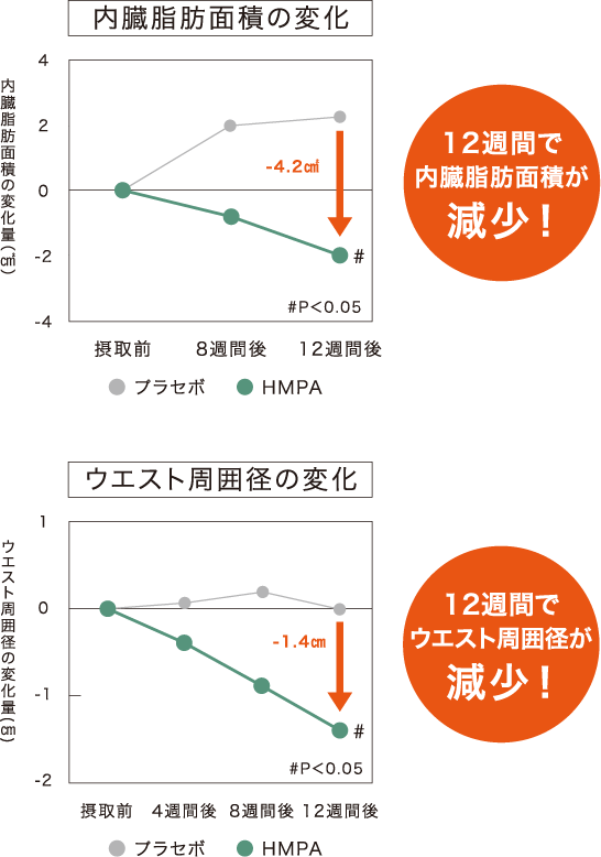 HMPAを1日23㎎、12週間毎日摂取することで、腹部の脂肪(内臓脂肪、腹部総脂肪)とウエスト周囲径を減少させる機能が報告されています。