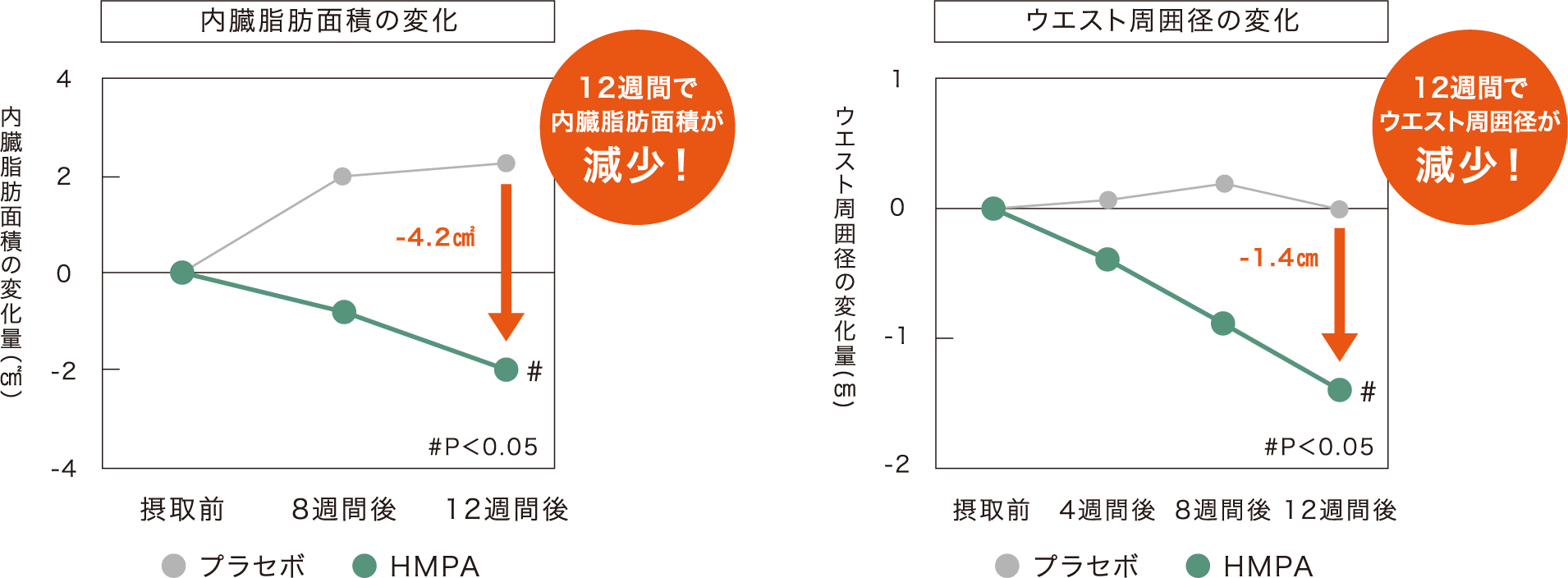 【試験デザイン】ランダム化二重盲検プラセボ対照並行群間比較試験【被験者】BMI23kg/m2以上30kg/m2未満の20歳以上65歳未満の健康な男女74名【試験項目】内臓脂肪面積(cm2)、ウエスト周囲径(cm)【試験食品】〈試験食〉HMPA23mg/日を含むカプセル〈対照食〉外見が同一でHMPAを含まないカプセル【摂取期間】12週間【結果】HMPA23mg/日含有食品または対照食品を12週間摂取し、内臓脂肪面積およびウエスト周囲径を評価したところ、HMPA摂取群で変化量が有意に減少したことが示された。【出典】 Jpn Pharmacol Ther(薬理と治療)vol.50 no.6 2022を改変●研究レビューによる評価です。●届出に使用した研究論文のうち、代表的な1報です。