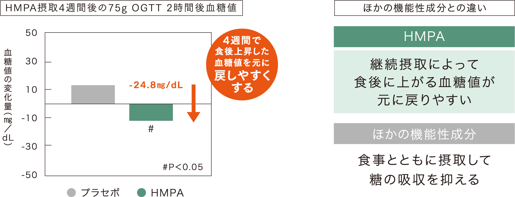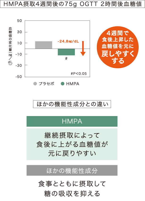 【試験デザイン】ランダム化二重盲検プラセボ対照並行群間比較試験【被験者】糖負荷検査(75g OGTT)において境界型または食後血糖値が高めで40歳以上65歳未満の健康な男女30名【試験項目】糖負荷検査(75g OGTT)【試験食品】〈試験食〉HMPA23mg/日を含むカプセル〈対照食〉外見が同一でHMPAを含まないカプセル【摂取期間】4週間【結果】HMPA23mg/日含有食品または対照食品を4週間摂取し、糖負荷検査(75g OGTT)における血糖値を評価したところ、HMPA摂取群で2時間後血糖値が有意に減少したことが示された。【出典】 Jpn Pharmacol Ther(薬理と治療)vol.50 no.5 2022を改変●研究レビューによる評価です。