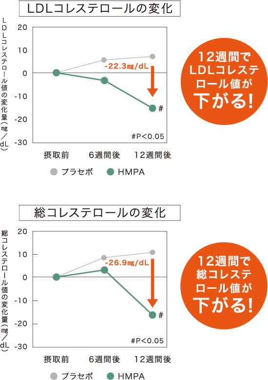 HMPAを1日23mg、12週間毎日摂取することで、LDLコレステロールおよび総コレステロールが下がることが報告されています。