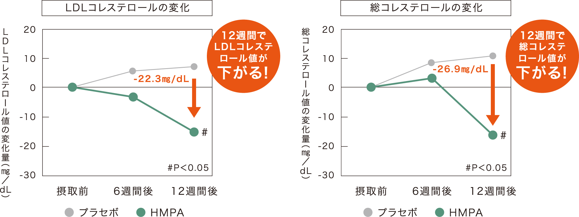【試験デザイン】ランダム化二重盲検プラセボ対照並行群間比較試験【被験者】LDLコレステロールが境界域型(120~139mg/dL)の健康な男女(20~64歳)18名【試験項目】LDLコレステロールおよび総コレステロールの変化量【試験食品】〈試験食〉HMPA23mg/日を含むカプセル〈対照食〉外見が同一でHMPAを含まないカプセル【摂取期間】12週間【結果】HMPA23mg/日含有食品または対照食品を12週間摂取し、LDLコレステロールおよび総コレステロールを評価したところ、HMPA摂取群で変化量が有意に減少したことが示された。【出典】 Jpn Pharmacol Ther(薬理と治療)vol.51 no.6 2023を改変 ●研究レビューによる評価です。